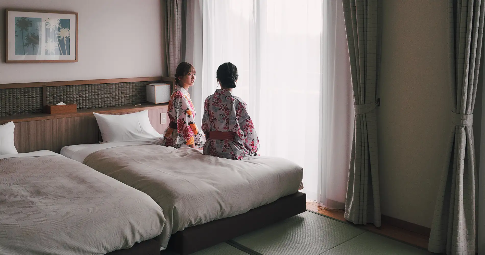 リラックス効果のある畳の空間と"ふかふかベッド"の組み合わせで快適にお過ごしいただけるお部屋です。