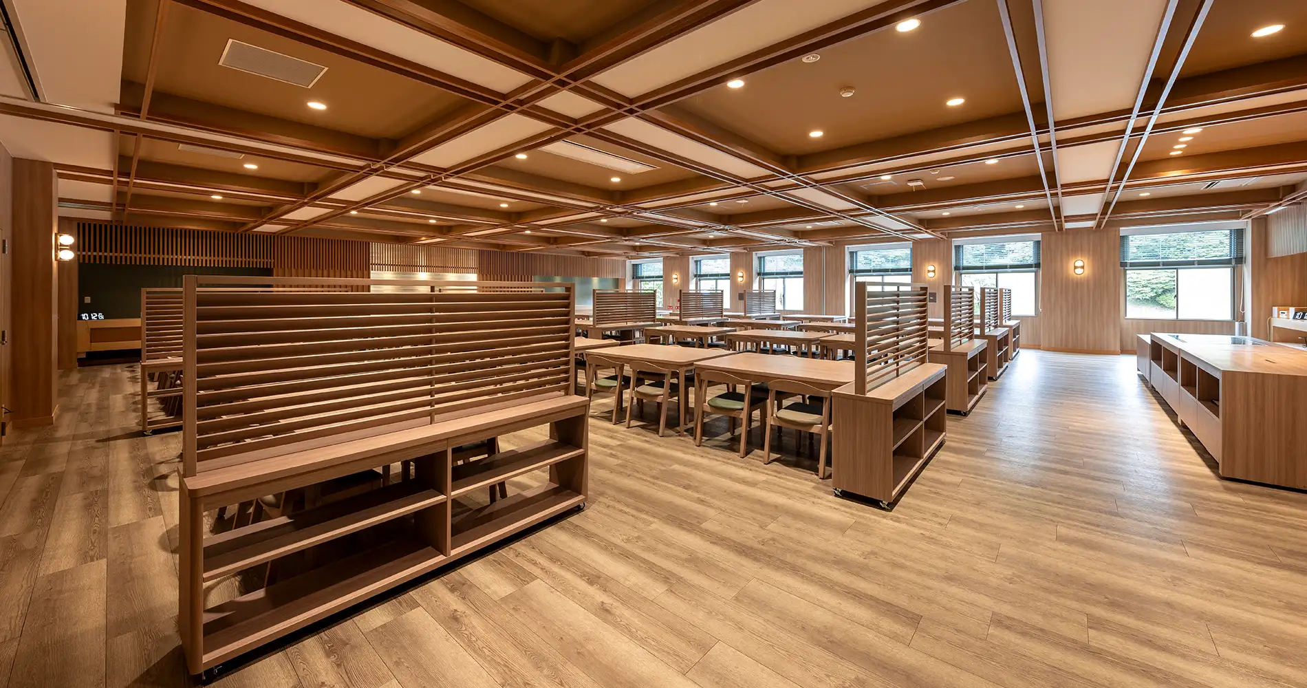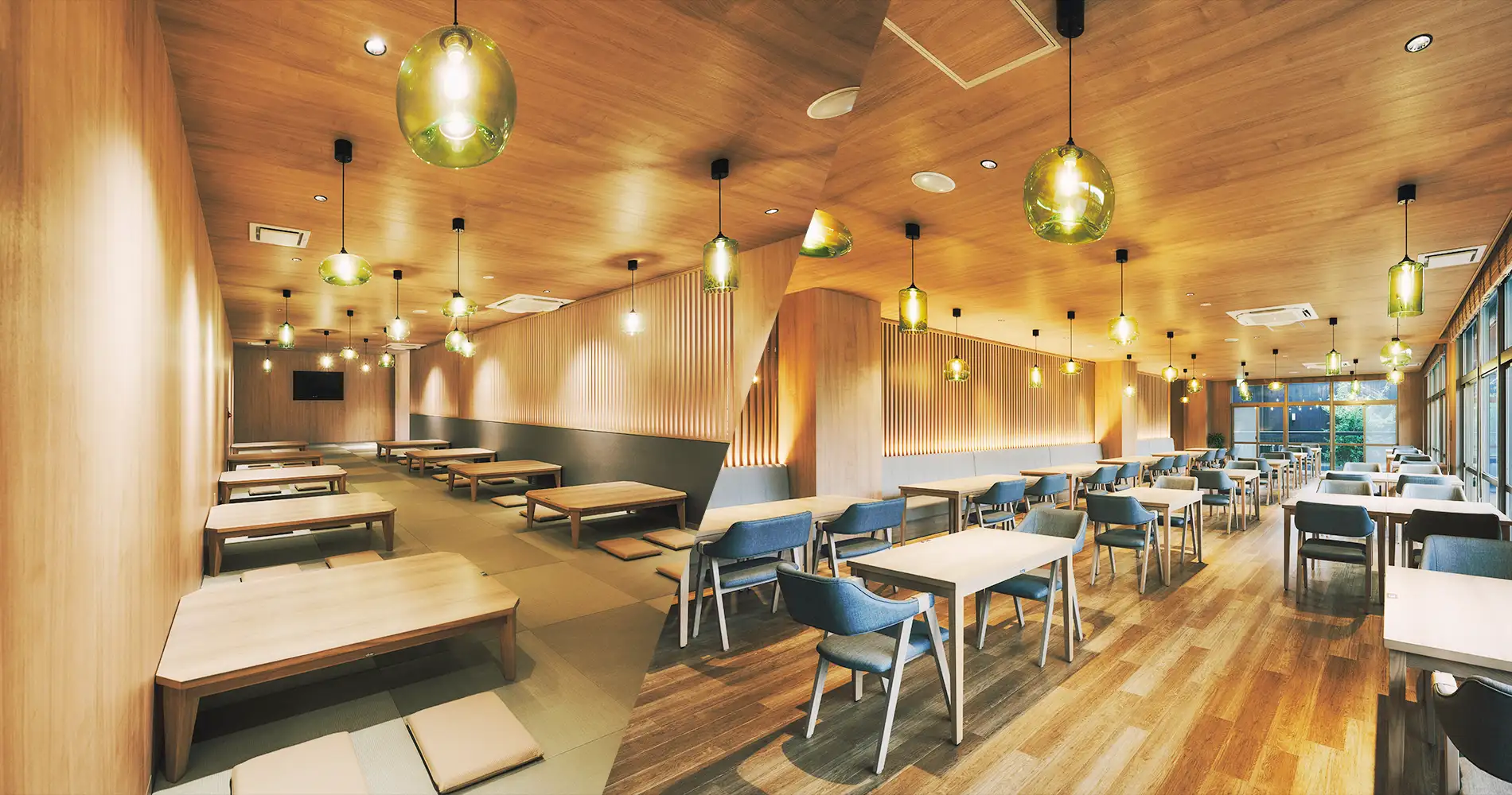 木目を基調としたデザインで温かみのある空間を演出。広々とした空間で夕食・朝食をお召し上がりください。