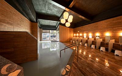 小座布団のスペースと椅子のスペースがあり、湯上り時にご利用いただけます。自然光が優しく差し込む、くつろぎの空間をお届けします。